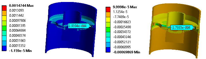 結(jié)構(gòu)受壓力變形后與原理圖所示一致。如果通過彎曲測量,那么這樣的位置可能并不適于粘貼應變計,因為這個空間并不容易打磨,除非擴大空間。原理圖上應該進行了大量簡化,因為這種結(jié)構(gòu)的粘貼操作是很難實現(xiàn)的,即使去掉中間的豎直圓桶也很難操作。因此可能是基于另一種測量方式。