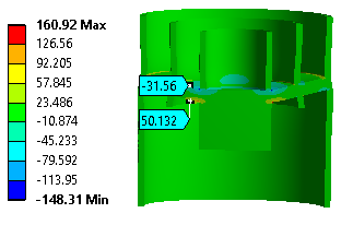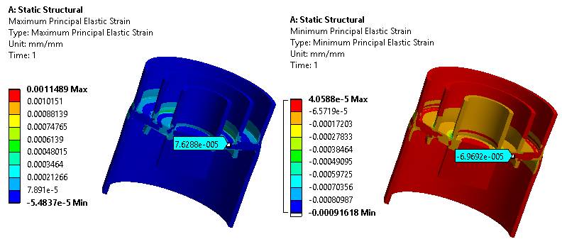 得到了下面的結(jié)構(gòu)與結(jié)果,看起來不錯,第一主應變和第三主應變達到近300微應變。采用兩片半橋片(通常用于測量Mx的那種)就可以組成全橋了。但這只是原理罷了,在這種曲面上貼片也許對于貼片人員來說是一種挑戰(zhàn)!